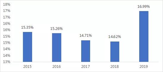2015-2019年我國城市平均供水管網(wǎng)漏損率(單位:%)