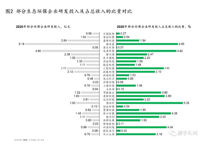 造成以上問題的原因很多,主要有兩個:一是國內(nèi)生態(tài)環(huán)保行業(yè)之前一直處于簡單、粗暴的“跑馬圈地”時代,強政府關(guān)系和低成本融資成為這一階段企業(yè)制勝的“不二法寶”,這種“浮躁”的大環(huán)境導(dǎo)致很多企業(yè)“重投建、輕技運”;二是創(chuàng)新型和革新型技術(shù)投入周期長,回報不明顯,很多企業(yè)尤其是三年任期制下的國企高層們?nèi)狈ψ銐蚰托模蒎e機制缺失也讓他們對高風(fēng)險的研發(fā)投入持謹(jǐn)慎態(tài)度,這從生態(tài)環(huán)保領(lǐng)域的上市企業(yè)的研發(fā)投入占收入的比重可見一斑(見圖2)。