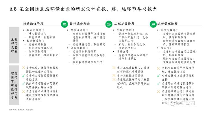 生態(tài)環(huán)保企業(yè)但凡上一點規(guī)模,都會將研發(fā)設(shè)計視為不可或缺的核心能力,對外進行宣傳,對上申請高新。他們對研發(fā)設(shè)計部門的職責(zé)描述也十分清楚,包括:負責(zé)自主創(chuàng)新與研發(fā),為客戶提供尖端技術(shù)和產(chǎn)品;開展國內(nèi)外技術(shù)合作,以及先進技術(shù)的引進、消化、應(yīng)用和系統(tǒng)集成;為投資拓展、工程建設(shè)等提供系統(tǒng)性的技術(shù)支持,如投資拓展過程中的技術(shù)盡調(diào)與評估、投標(biāo)技術(shù)方案編制;協(xié)調(diào)處理技術(shù)相關(guān)的突發(fā)事件和重大事故;新建、改擴建項目的技術(shù)論證和技術(shù)管理;審核存量項目改擴建計劃,包含建設(shè)水平的制定、工藝路線的確定、設(shè)備的技術(shù)規(guī)格參數(shù)、咨詢設(shè)計單位的管理、設(shè)計優(yōu)化等。